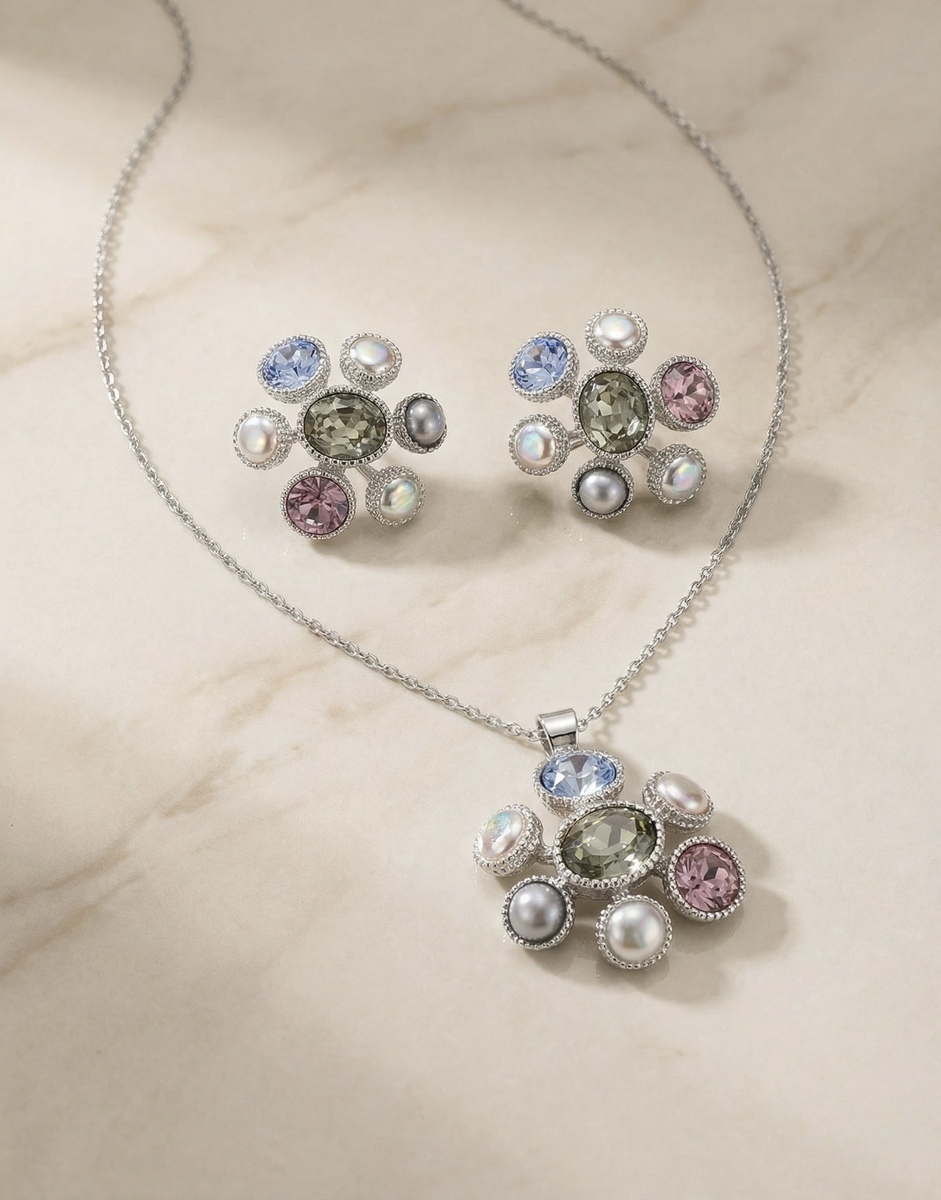 Set aretes + Collar en Rodio Plateado con Azul, Blanco y Rosado ZSJC02-03